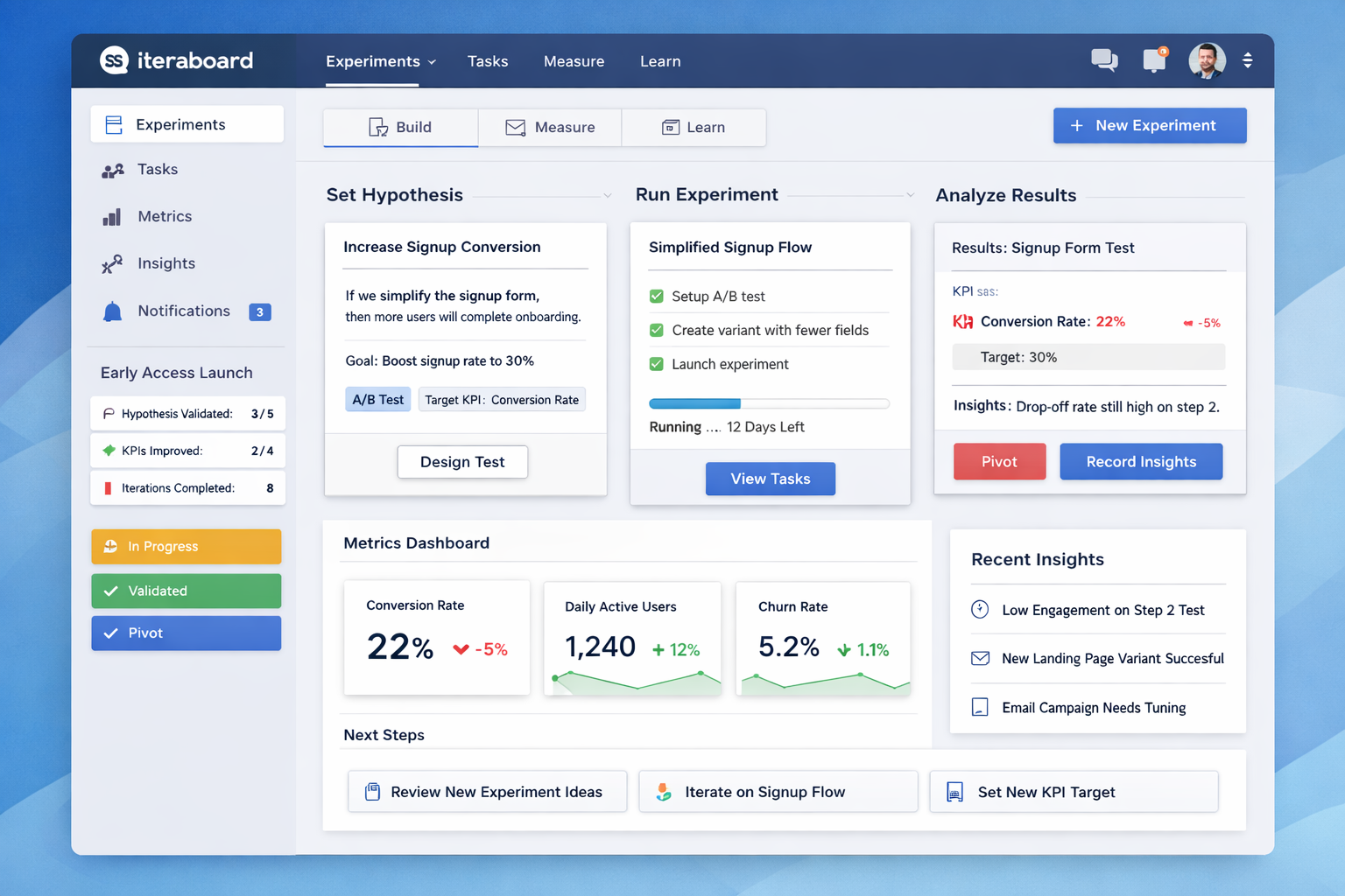Iteraboard makes learning visible. Instead of juggling tasks, notes, and metrics across tools, everything lives in one place — structured around experiments and outcomes.